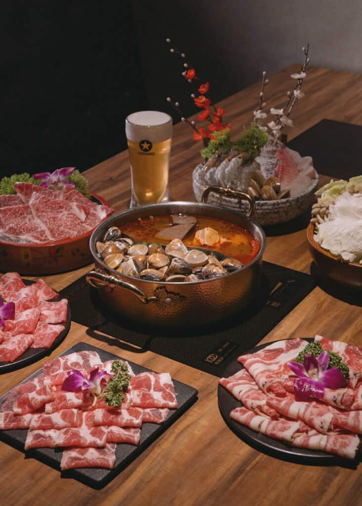 我特別推薦的湯底有三種:麻辣鍋利用草果、藥材與微苦底構成複雜香氣,辣度適中;青花椒湯底則帶麻不帶火辣,順口不嗆;最浮誇的是爆量清酒蛤蜊鍋,店家會一次放上近 1 公斤的新鮮蛤蜊,不只視覺驚人,湯頭也滿溢鮮味。這三款湯底輪著涮肉、海鮮或者青菜,都讓我一口接一口。