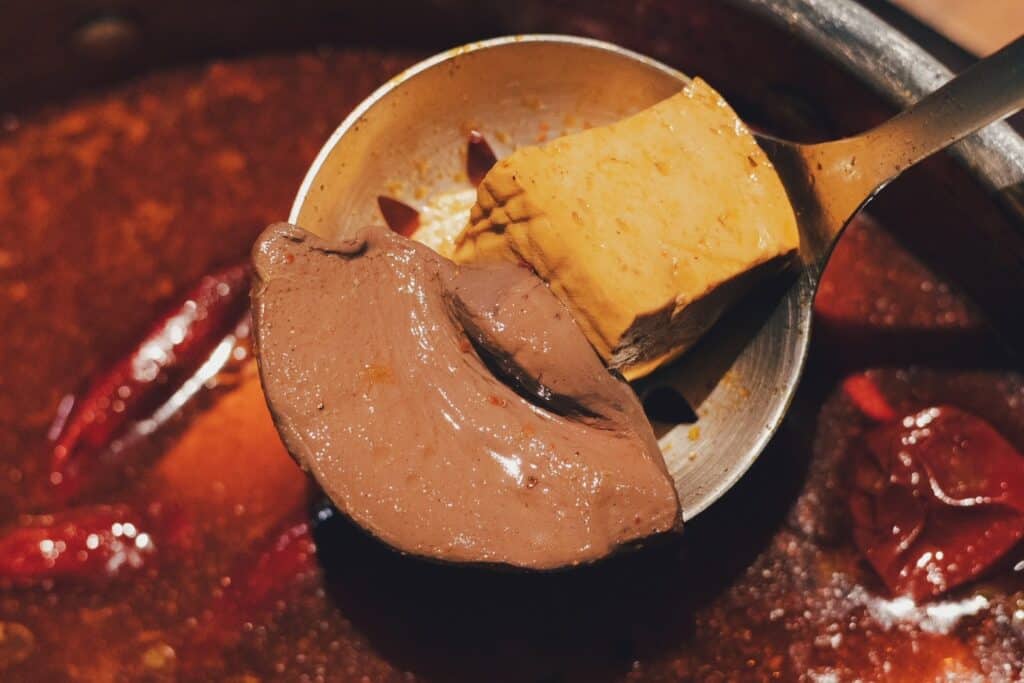 米釉的鴨血非常軟嫩,幾乎一入口就能感受到滑順的口感,咀嚼間還會爆出麻辣或青花椒的湯汁,讓人忍不住一塊接一塊。豆腐則是另一種驚喜,吸附湯汁後,外層入味、內裡仍保有細緻的綿密感。這兩樣小配角,常常在我們聊天的時候成為不自覺一直夾取的食材,甚至到最後覺得比肉類還要耐吃。